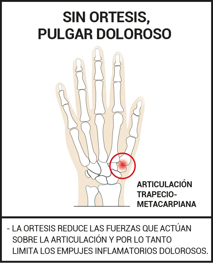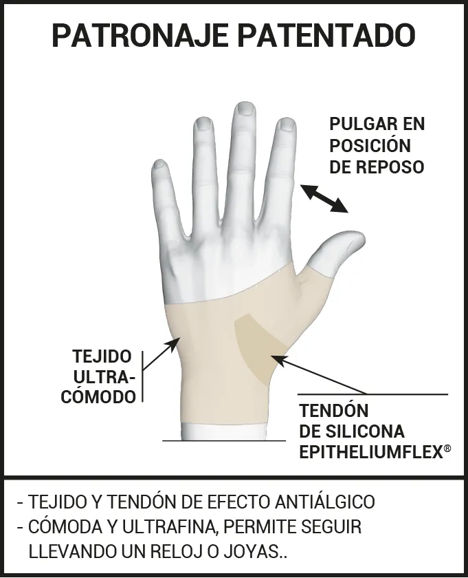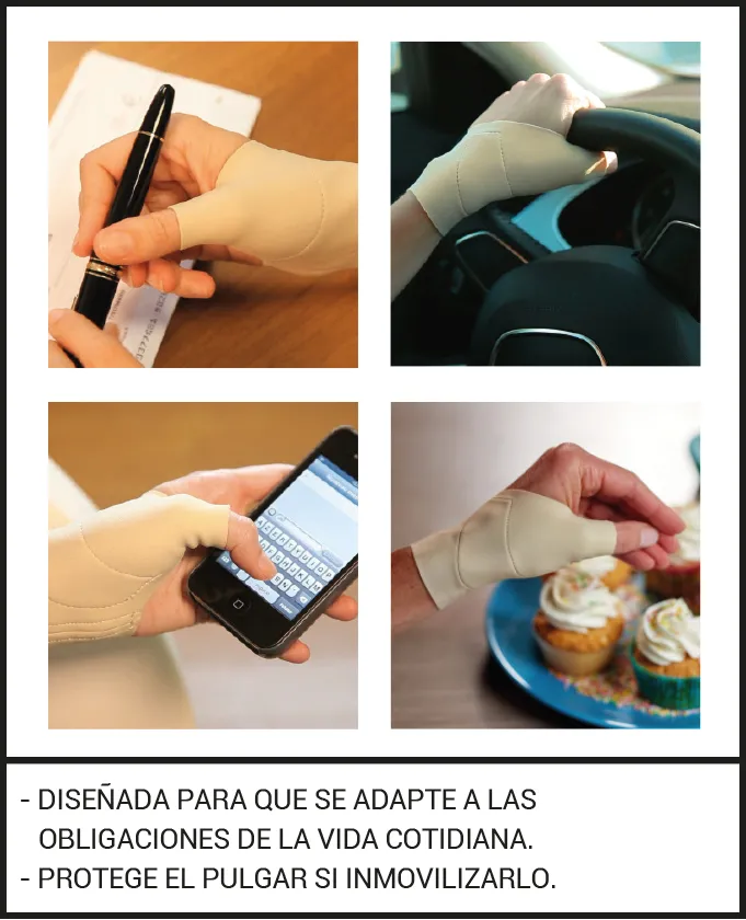 Mantiene y alivia el pulgar en caso de rizartrosis (artrosis del pulgar), sin entorpecer la movilidad.